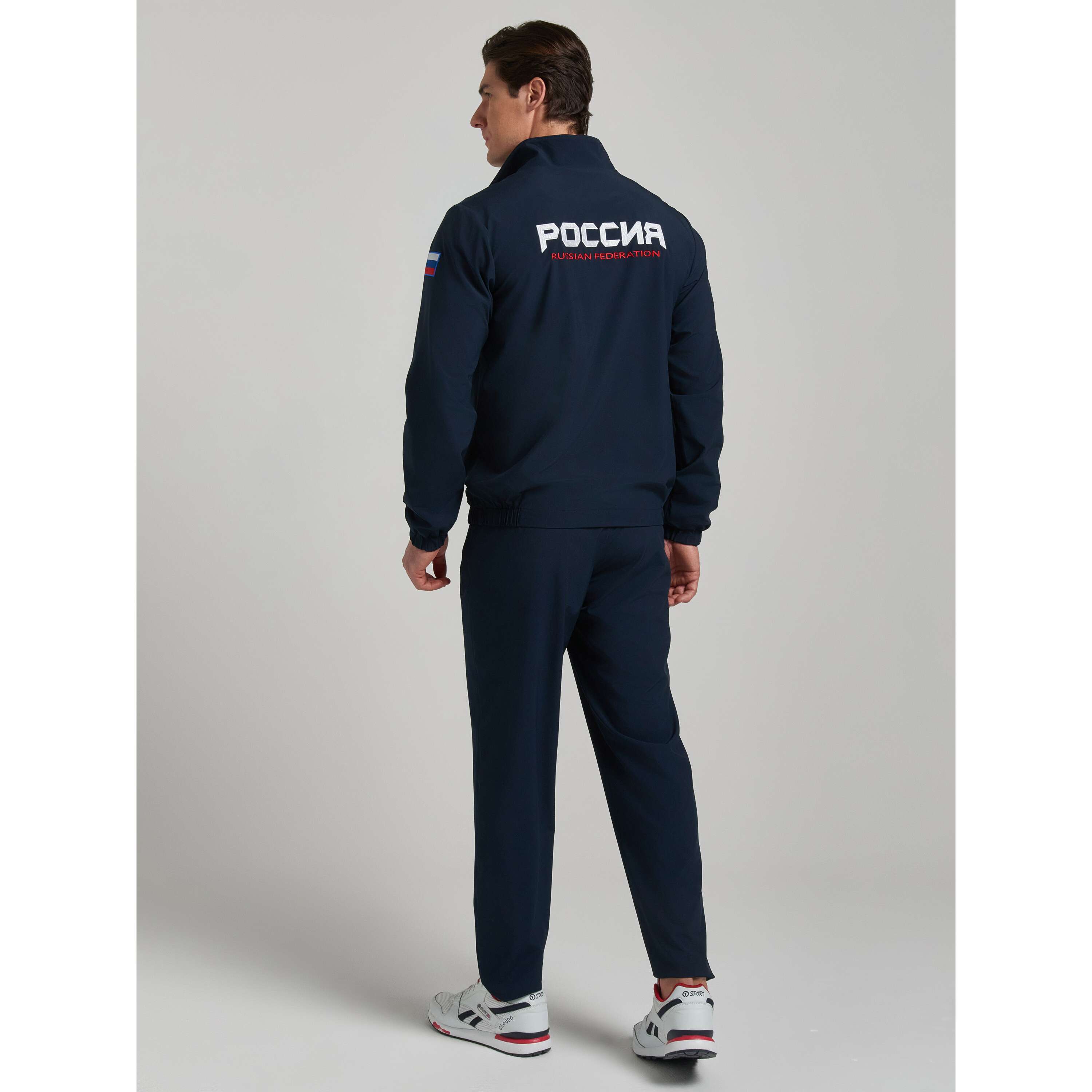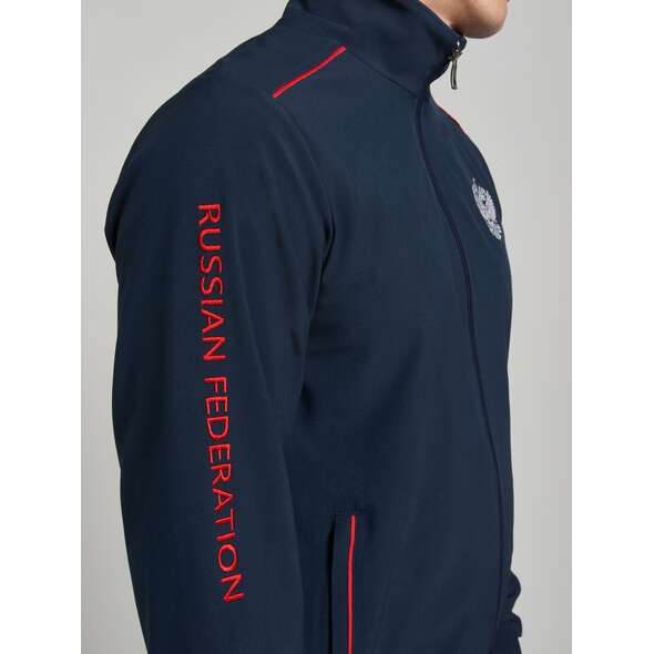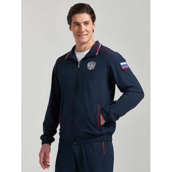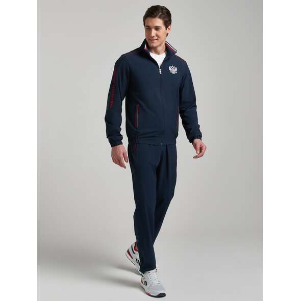 Спортивный мужской костюм изготовлен из легкой плащевой ткани с добавлением лайкры, которая при носке обладает упругим растяжением подобно трикотажному полотну. Куртка на молнии с воротником, с подкладкой из легкой трикотажной сетки. Куртка свободного силуэта, заужена книзу эластичным поясом, воротник- стойка выполнен из полосатой трикотажной резинки. . Карманы прорезные, с молниями. Крой рукава - втачной, низ рукава слегка заужен эластичным манжетом. Слева на груди вышивка "герб России", На левом рукаве вышивка аппликация - флаг России, на правом вышивка "Russian federation", на спине надпись РОССИЯ russian federation. Все вышивки выполнены цветными шелковыми нитями. Брюки костюма на сетчатой подкладке. Карманы брюк прорезные, с молниями. Слева под карманом вышивка Россия выполненнная белыми нитями.
